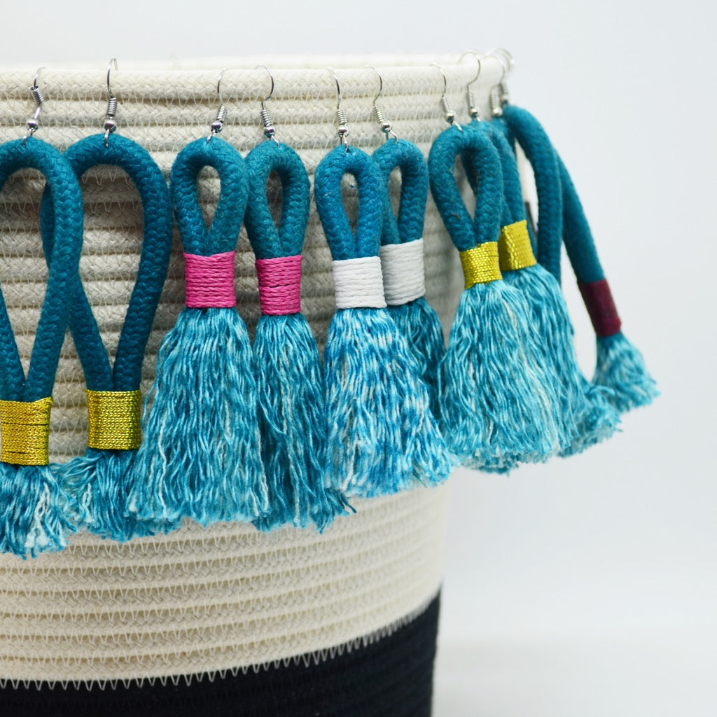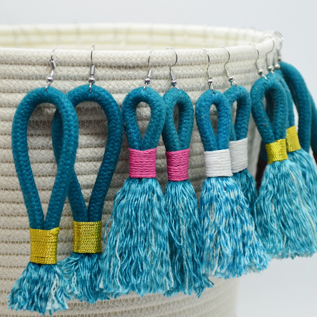 Mia Mélange earrings are made from 100% cotton rope wrapped with thread. The cotton is grown locally in South Africa by farmers who are members of the Better Cotton Initiative (BCI).