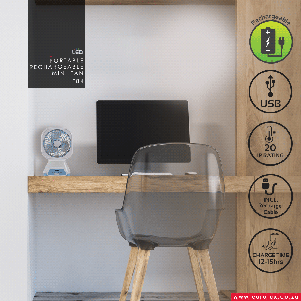 Keep cool on the go with the Eurolux Rechargeable Portable Mini Fan. This compact fan is perfect for outdoor events, travel, and hot summer days. Featuring a rechargeable battery, it provides up to 6.5 hours of continuous use. With its sleek white design, stay cool and stylish wherever you are.