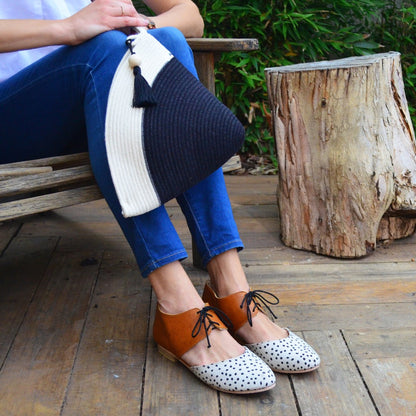 Our handle clutch is the perfect everyday bag or fancy evening clutch. Its unique shape will comfortably fit all your essentials and more. The bottom of the clutch is rope dyed black and the top is natural ivory. The bag comes with a zipper and a stylish tassel. Please note that we have updated the design: the zip closes towards the handle, and the tassel is tied onto the zip slider.