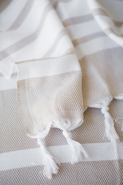 Our Herringbone Turkish Towel is a luxurious, thicker weave. Woven in a dense, flat style, it will add sophistication and elegance to any home and outdoor space.
