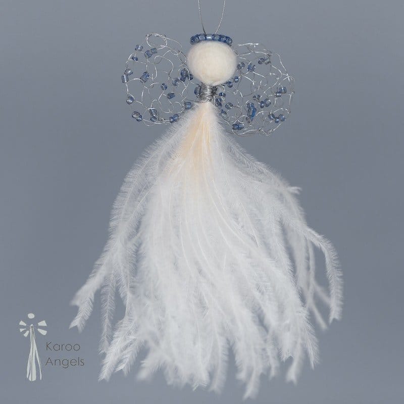 The small feather angels are 11-13 cm long – an ideal size to hang on a Christmas tree, or in a window – or use as a small gift to someone who deserves something really special… Please notice that the feathers might appear a bit “flat” when packed – but when the angel is exposed to air, the feathers will unfold and look more and more fluffy and voluminous.
