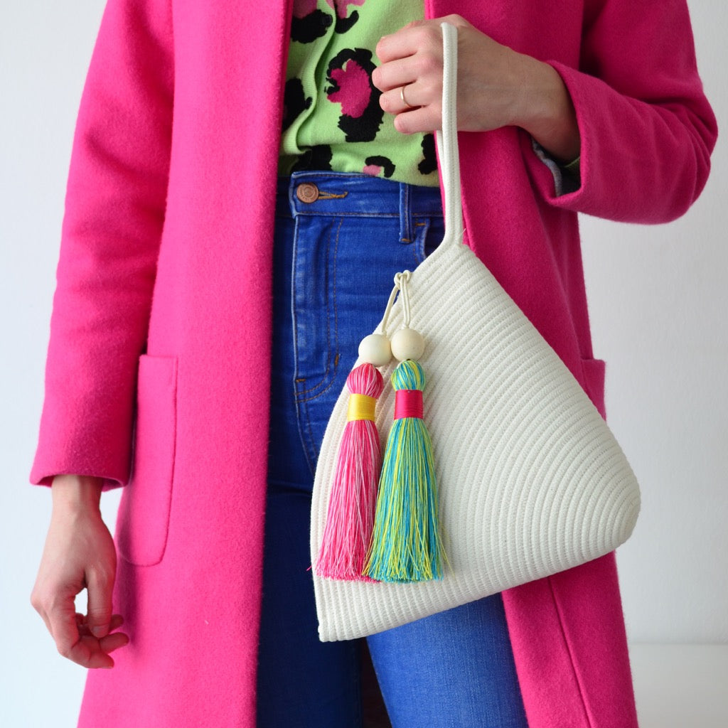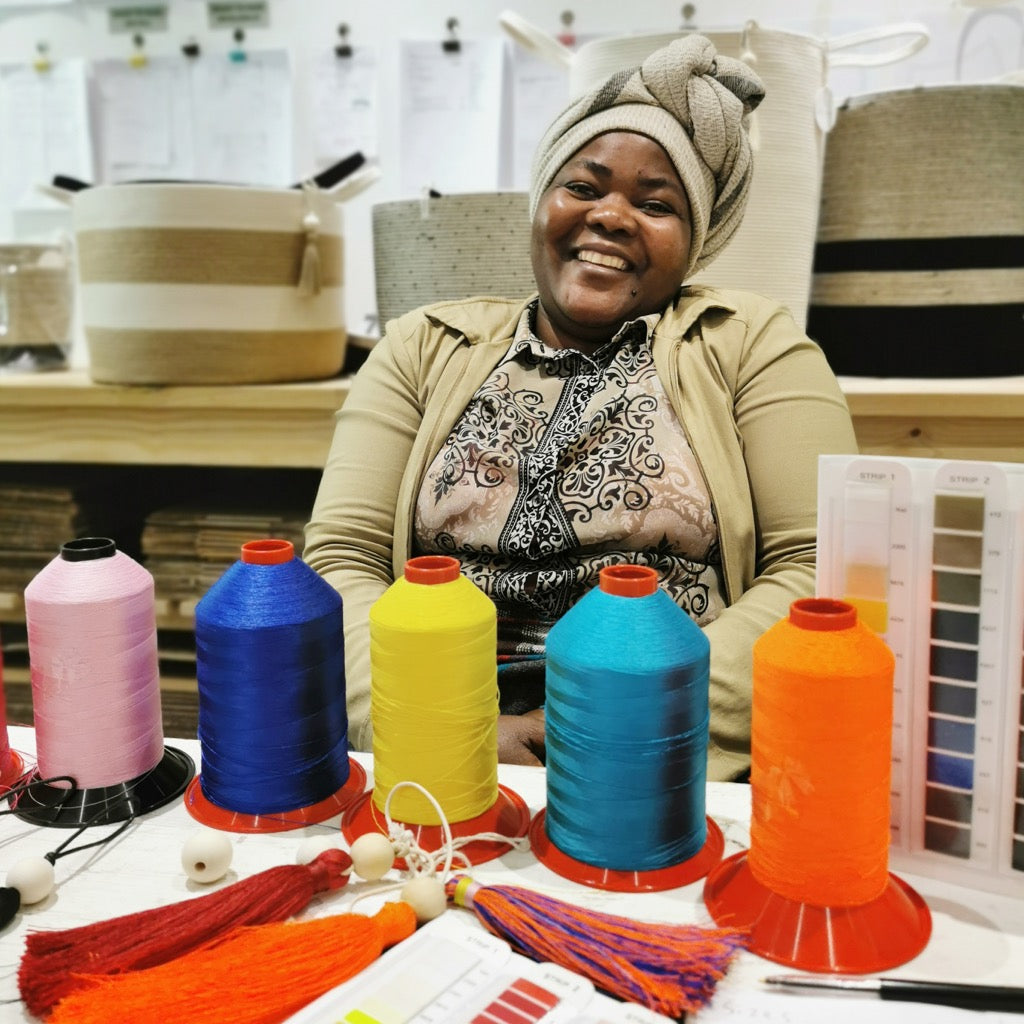 Mia Mélange tassels are all made in our studio by the very talented Fina! Our tassels are available in a range of colours. We can also make custom tassels to order. Fina used to be a full time domestic worker, working in a few homes in and around Stellenbosch. She used to work at Mia Mélange one day a week, cleaning our studio and shop. When she lost her job for another day in the week, we offered for her to work at Mia Mélange that day too. We quickly realised that Fina is very talented and loves working with her hands. She's a great fit for our team, and always makes us laugh! More and more, she began helping us out with handwork tasks like preparing tags, making finishings for products, and she mastered the craft of tassel making. She developed a real love for this craft. She told us that she wanted to make all our tassels from then onwards, and she promoted herself to chief tassel-maker!