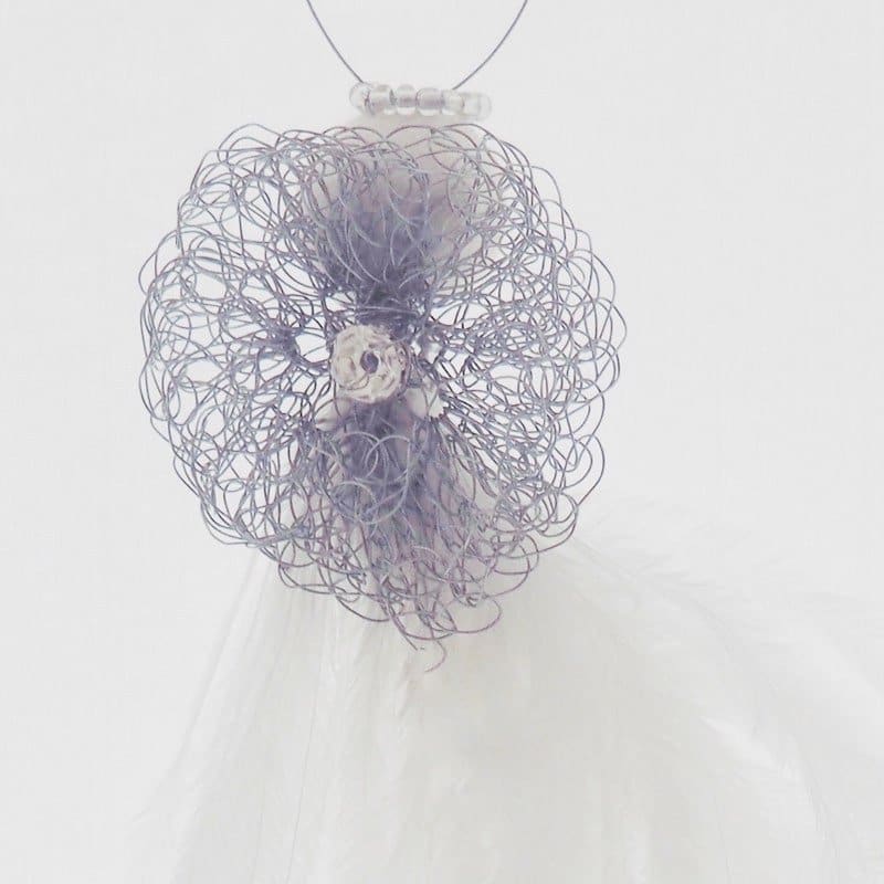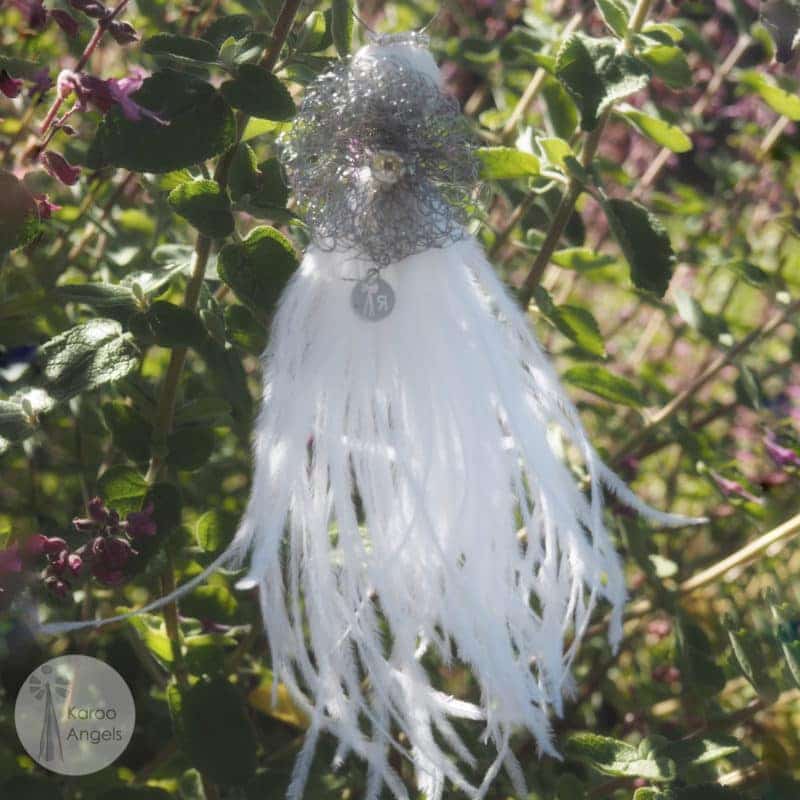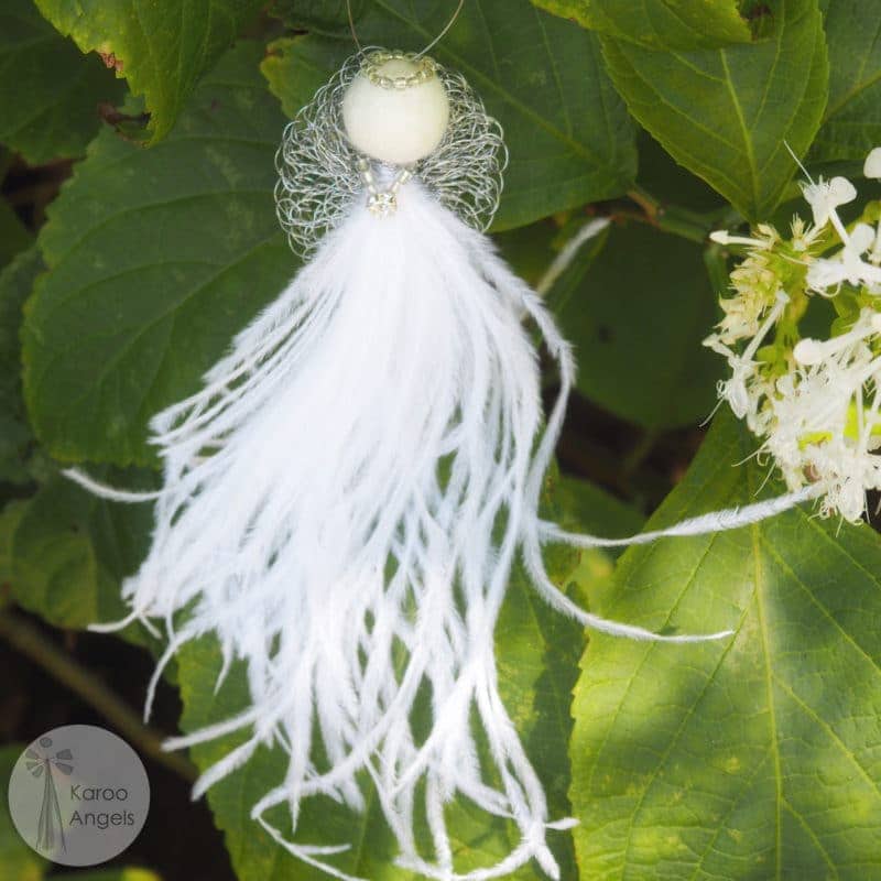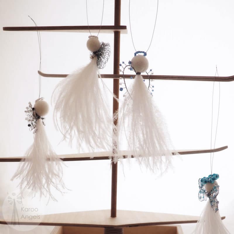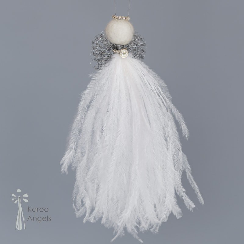 The medium feather angels measure approx 15 – 17 cm, and they look so majestic hanging in a window, or at a prominent spot on the Christmas tree. You will notice that the medium feather angels look more and more grand the longer their feathers are exposed to air. No wonder the medium feather angels are many Karoo Angels’ clients favourites.