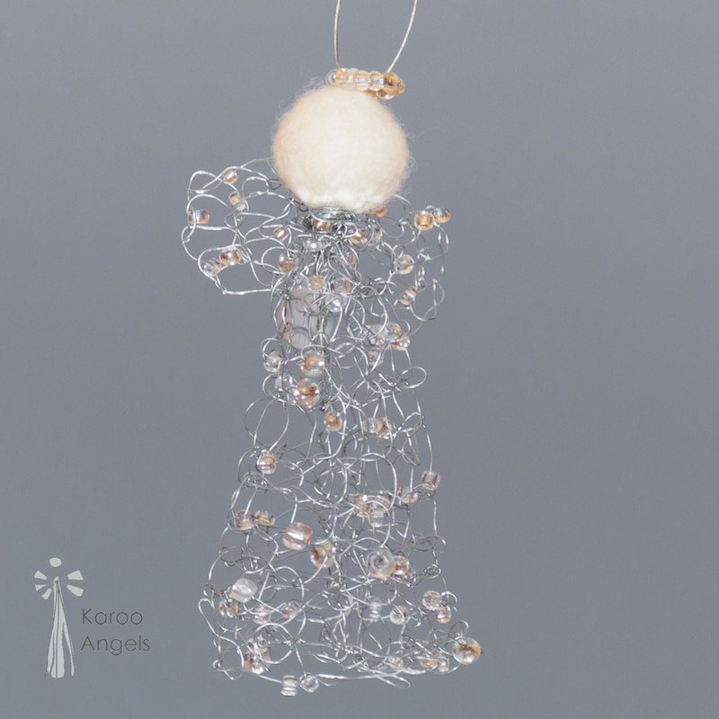 The wire angels were the very first angels to be made at the Angel Factory, dating back to 2005. Some of the wire angels are knitted, others are crocheted, and they have different types of beads, sequins and adornments to underline the superior craft quality.