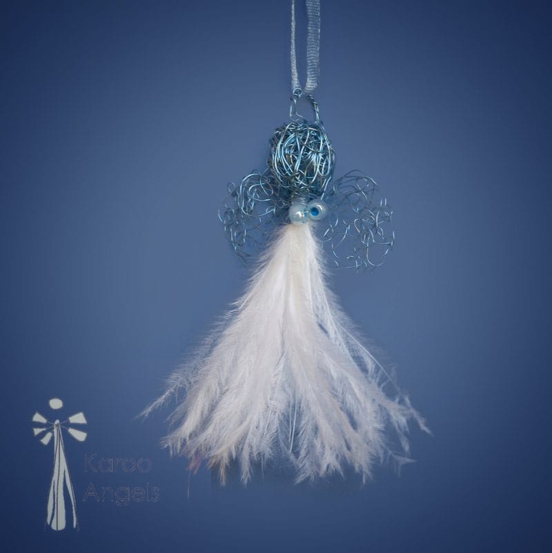 We have always dreamt of a Karoo Angels Jewellery range, and over the years we have been experimenting quite a lot, with Violet at Vondeling being the Master crafter in working out tiny, tiny versions of the classic range. But we knew that we needed a better wire that would not tear on clothes, only the best glass beads, as well as some exquisite type of ribbon. And in 2019 all finally came together – and we are so proud to present the Vondeling Juweels, in 6 different colour ways. The wire used is ultra thin coated copper wire, which indeed only skilled crafters can manage to knit with, a Preciosa glassbead is adding some weight to the pendant, and the matching hand dyed silk ribbon completes the look. We think the Juweel angels live up to their name: True gems! And of course you can use these miniature angels as decorations.