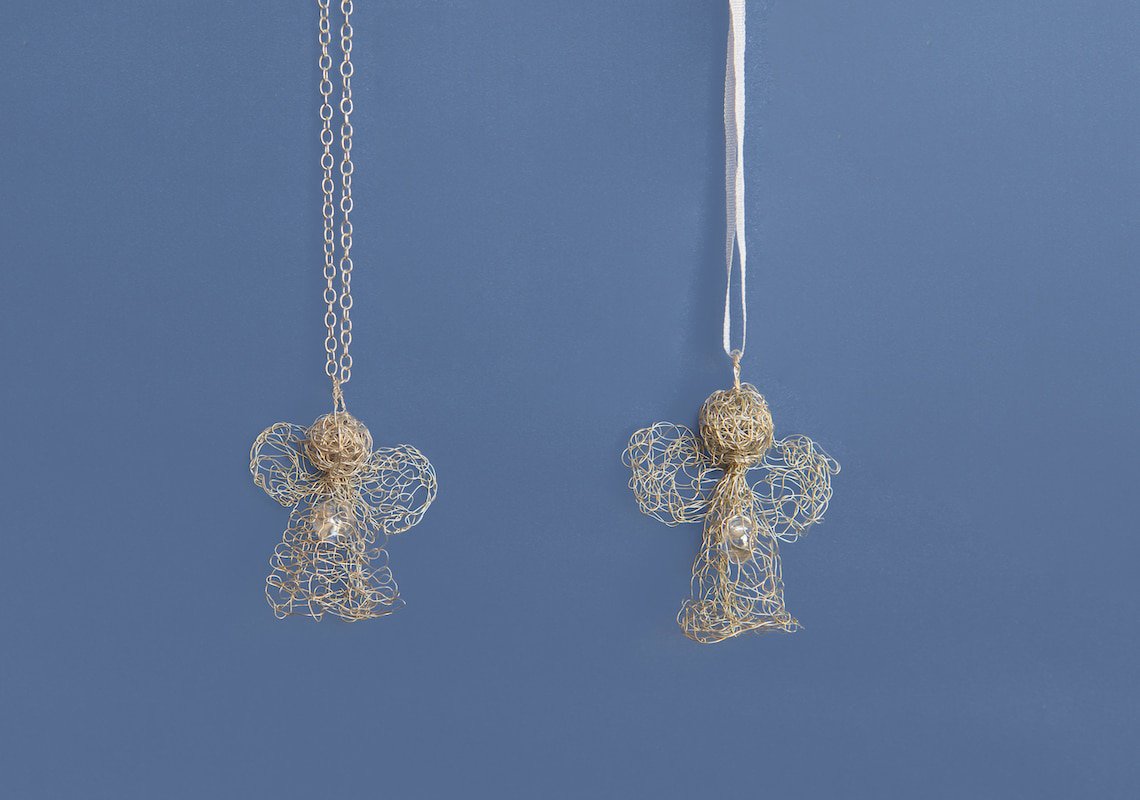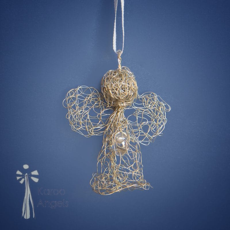 She has always dreamt of a Karoo Angels Jewellery range, and over the years we have been experimenting quite a lot, with Violet at Vondeling being the Master crafter in working out tiny, tiny versions of the classic range. But we knew that we needed a better wire that would not tear on clothes, only the best glass beads, as well as some exquisite type of ribbon. And in 2019 all finally came together – and we are so proud to present the Vondeling Juweels, in 6 different colour ways. The wire used is ultra-thin coated copper wire, which indeed only skilled crafters can manage to knit with, a Preciosa glass-bead is adding some weight to the pendant, and the matching hand-dyed silk ribbon completes the look. We think the Juweel angels live up to their name: True gems! And of course, you can use these miniature angels as decorations.